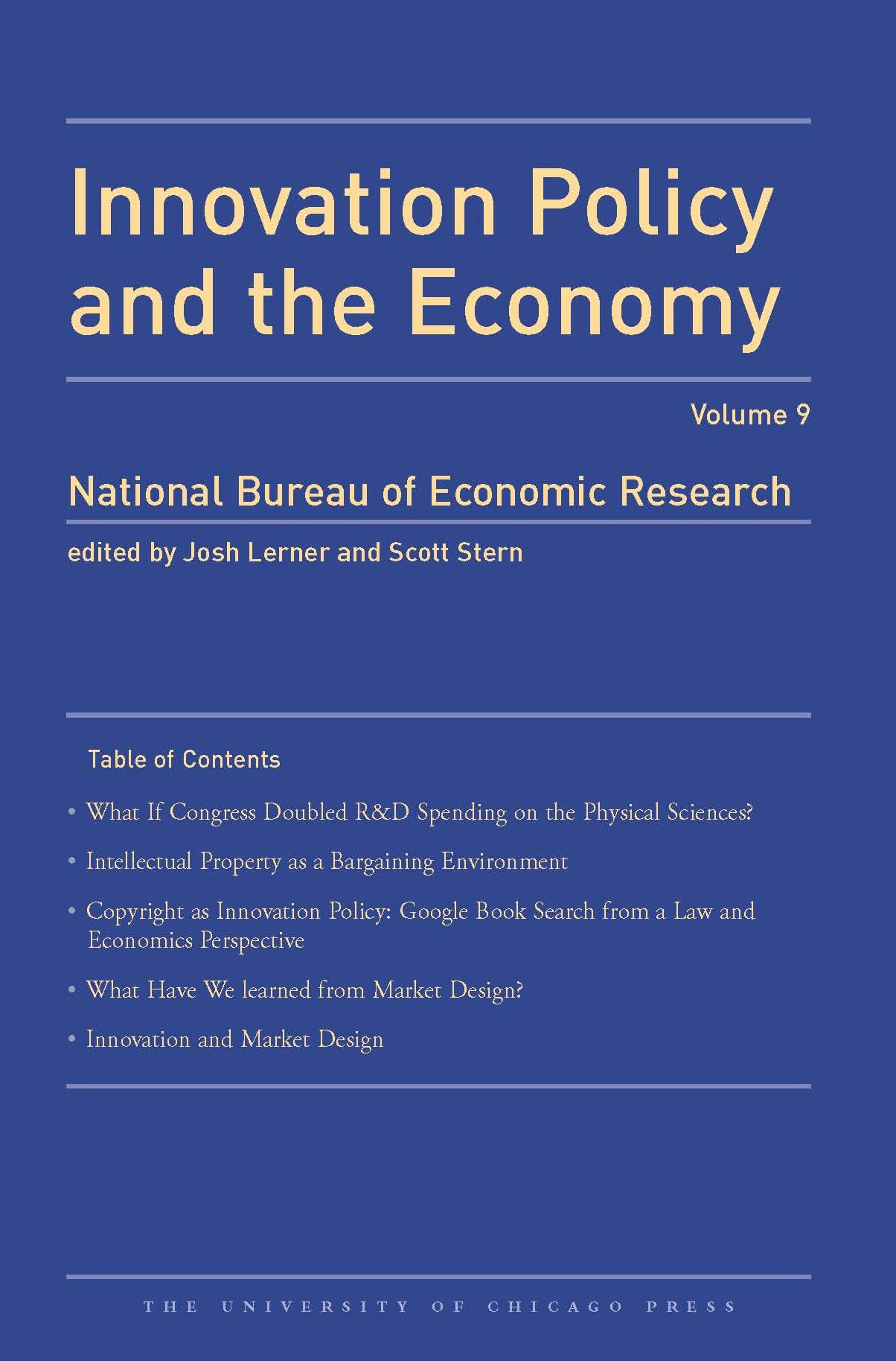 This volume provides a forum for research on the interactions among public policy, the innovation process, and the economy. Issues covered in Volume 9 include Congressional R&D spending on the physical sciences, intellectual property as a bargaining environment; pricing patents, and market design and innovation.